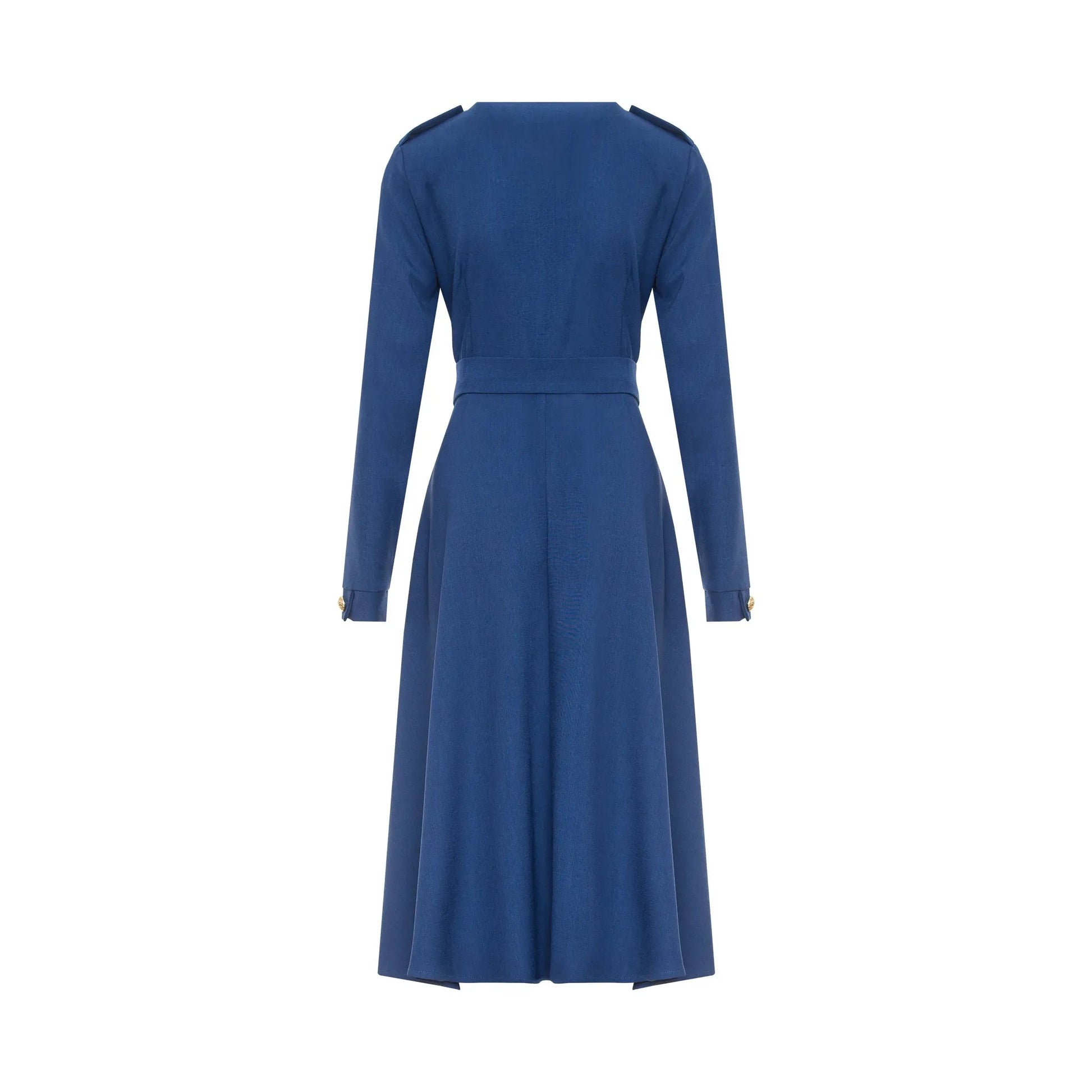 Blue fit and flare dress is made using a fine wool blend suit fabric. Fitted through the upper body with a long sleeve, dress's A-line, midi length offers a universally flattering silhouette. This is a modern, elegant office-to-cocktails staple.