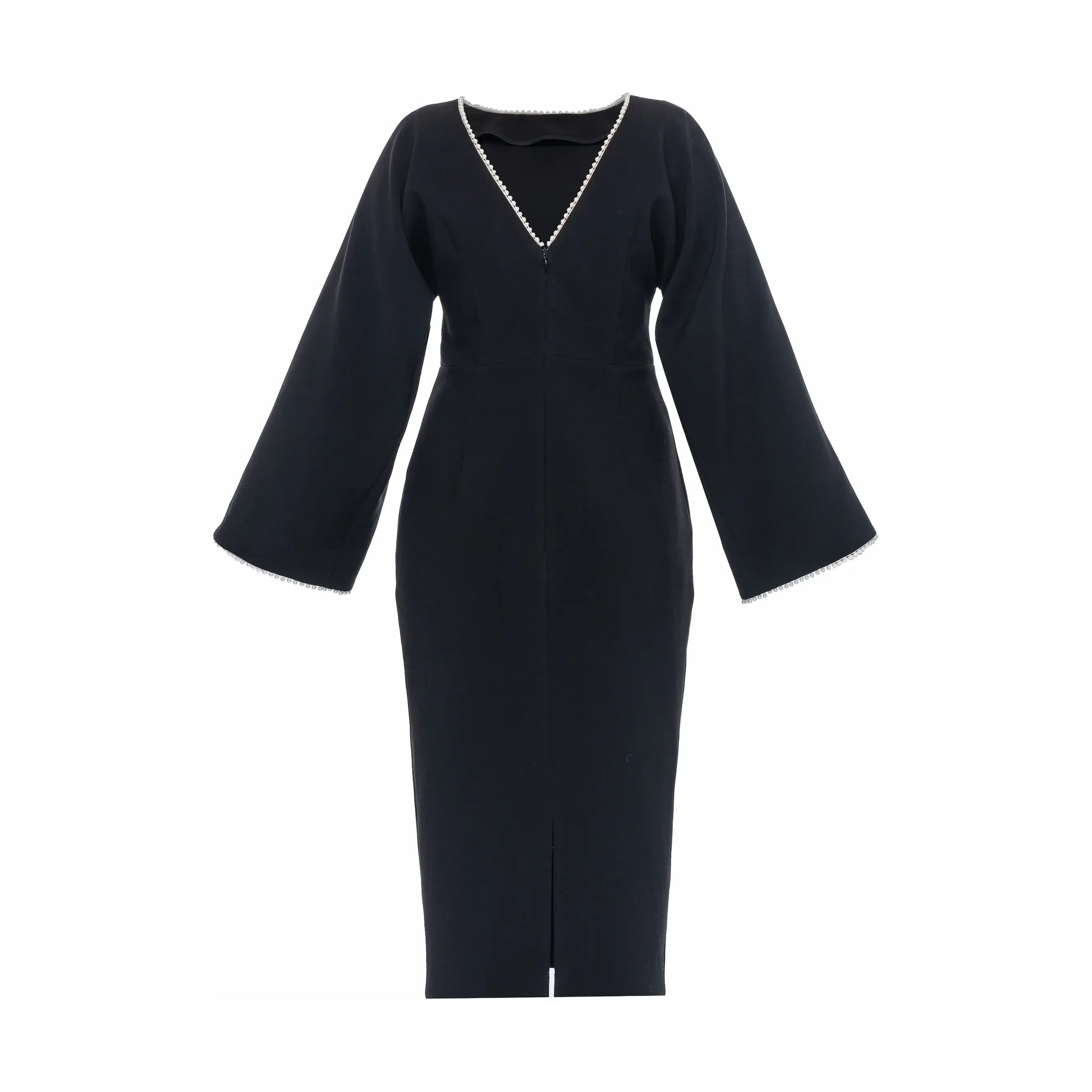 Wide sleeves visually slim the silhouette. The perfect cut, strict front and V-shaped neckline on the back make you feel intelligently sexy in this elegant black dress. The beaded trim makes the look more interesting and eye-catching. An elegant office-to-cocktails staple.