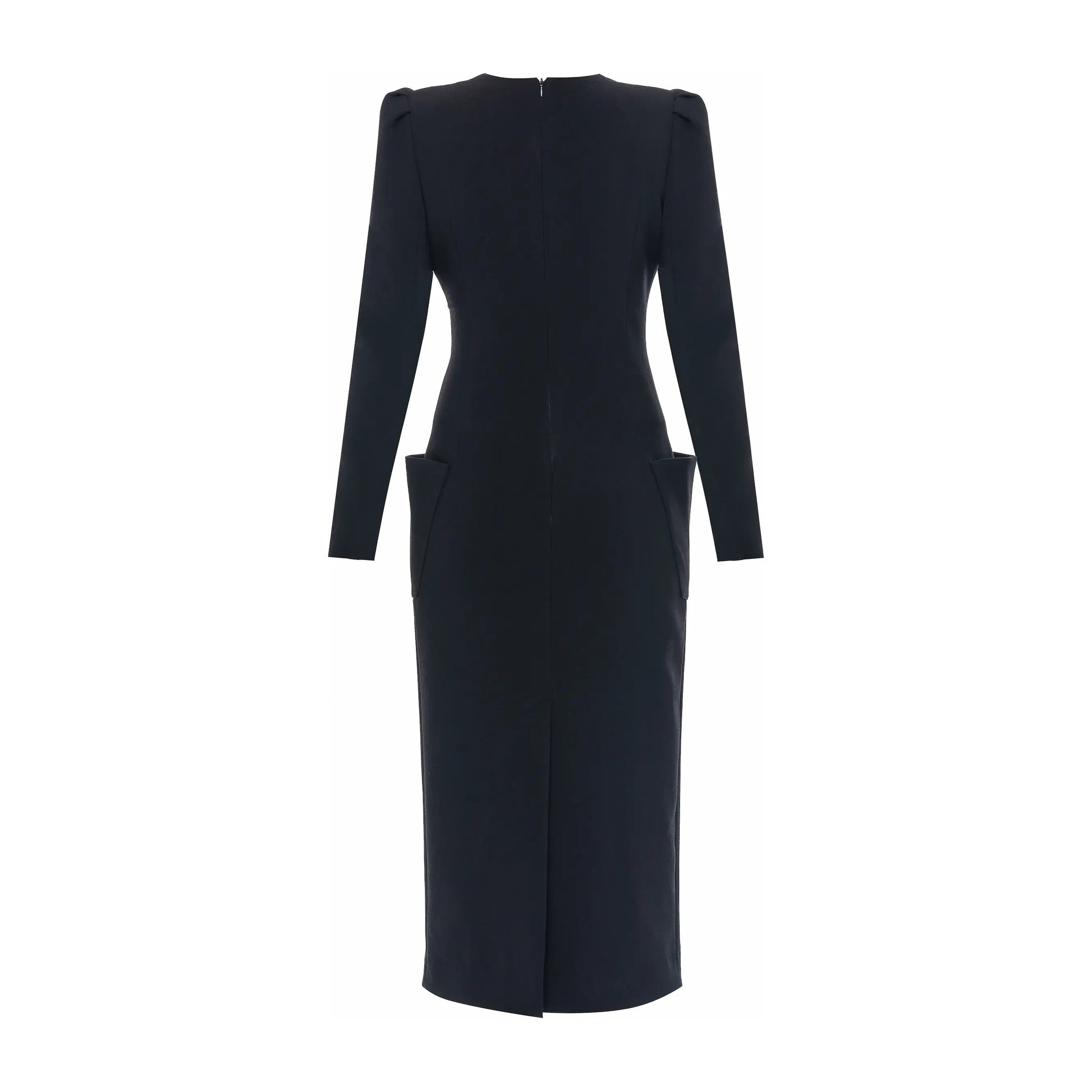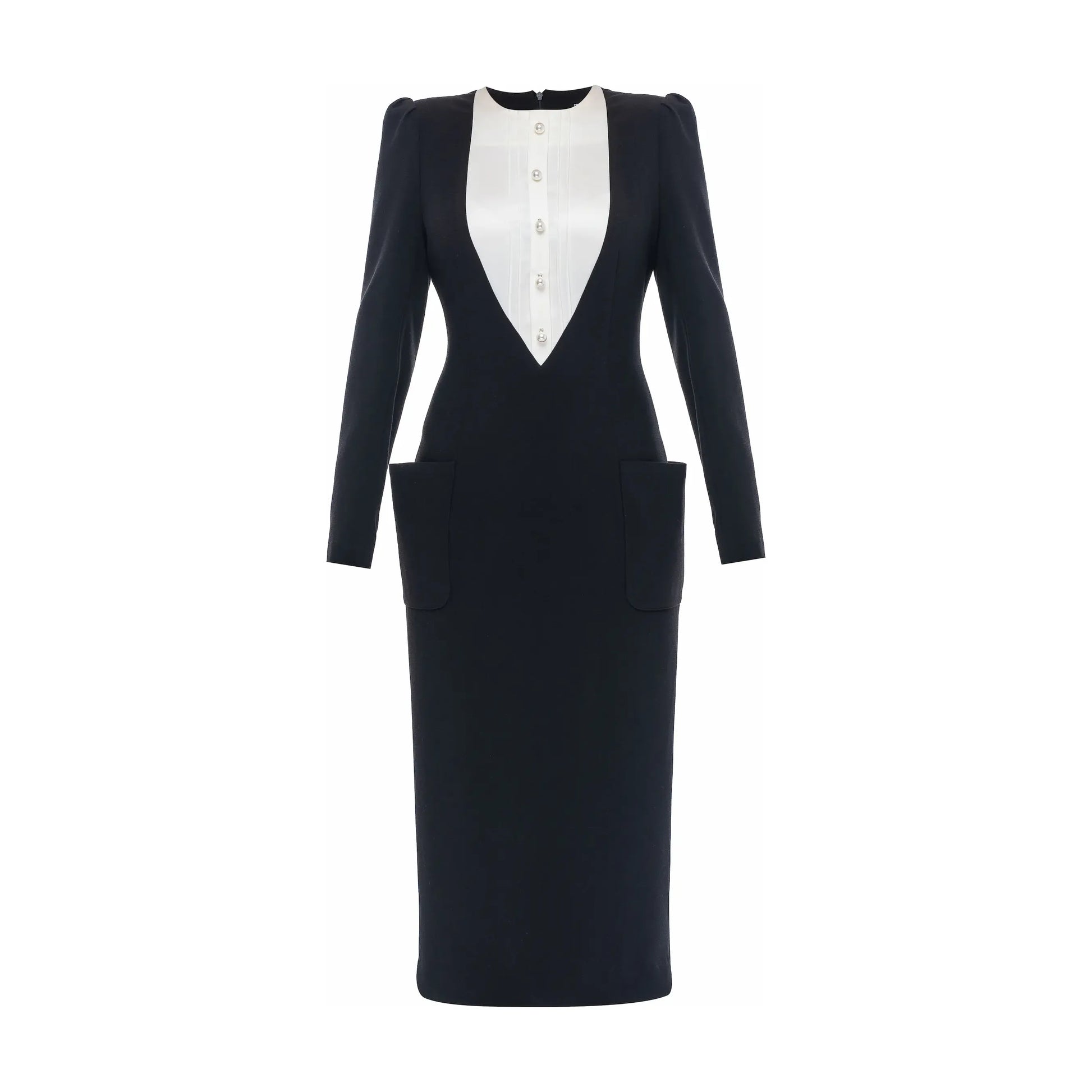 A form-sculpting black pencil dress with a sewn-in white cotton chemisette embellished with "pearl" buttons and patch pockets.