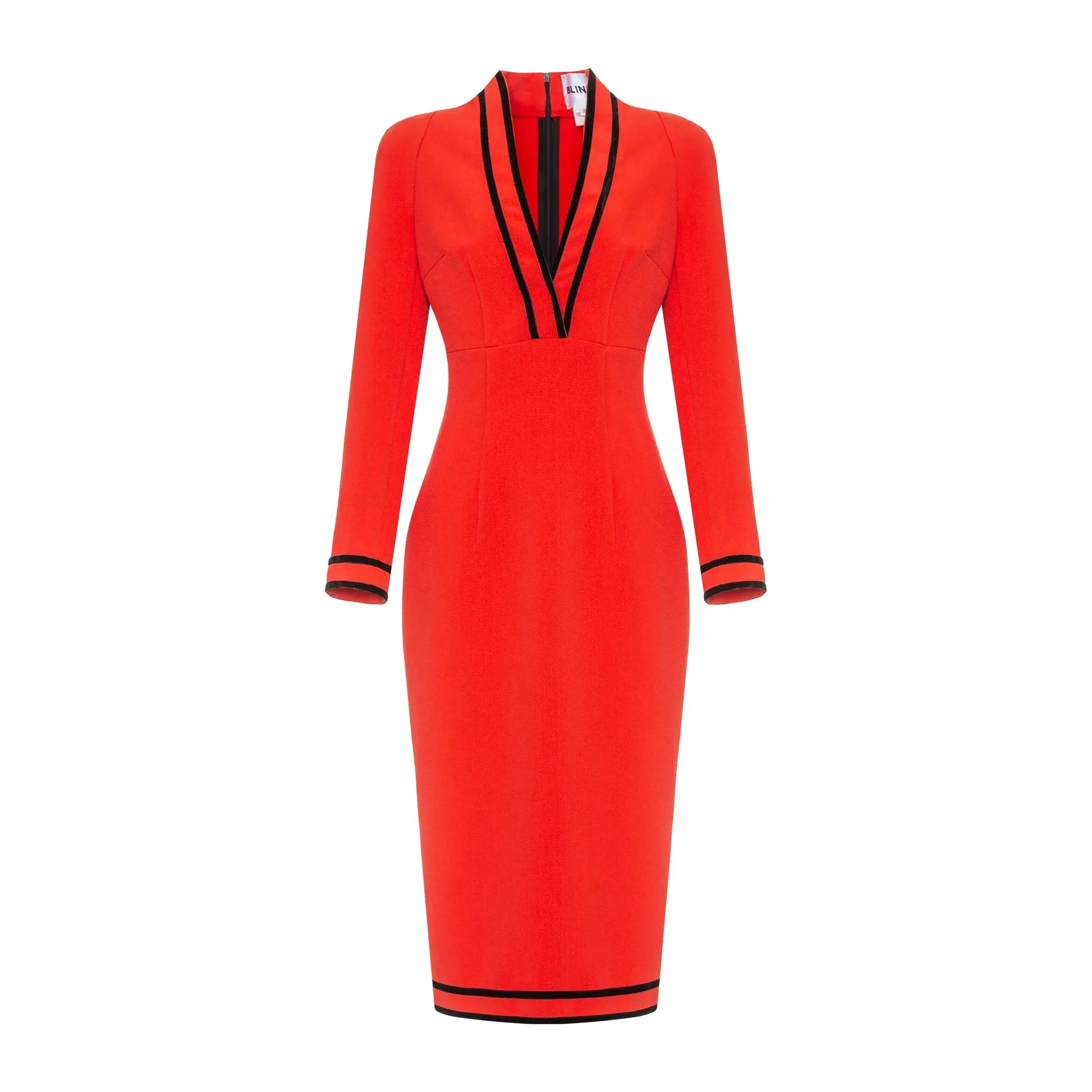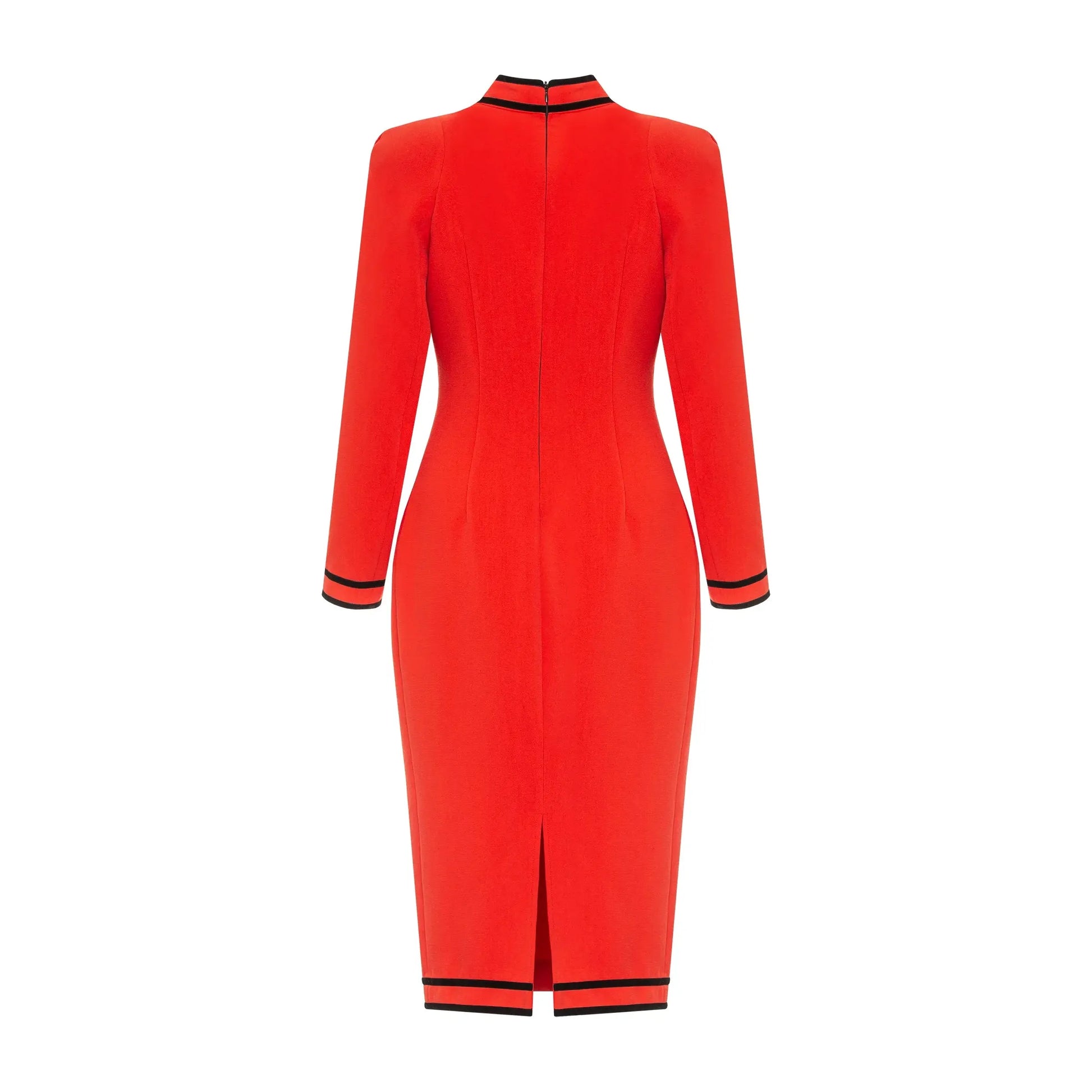 A fabulously form-shaping pencil dress in stunning terracotta, featuring a stand-up collar with a deep neckline and a back skirt slit.